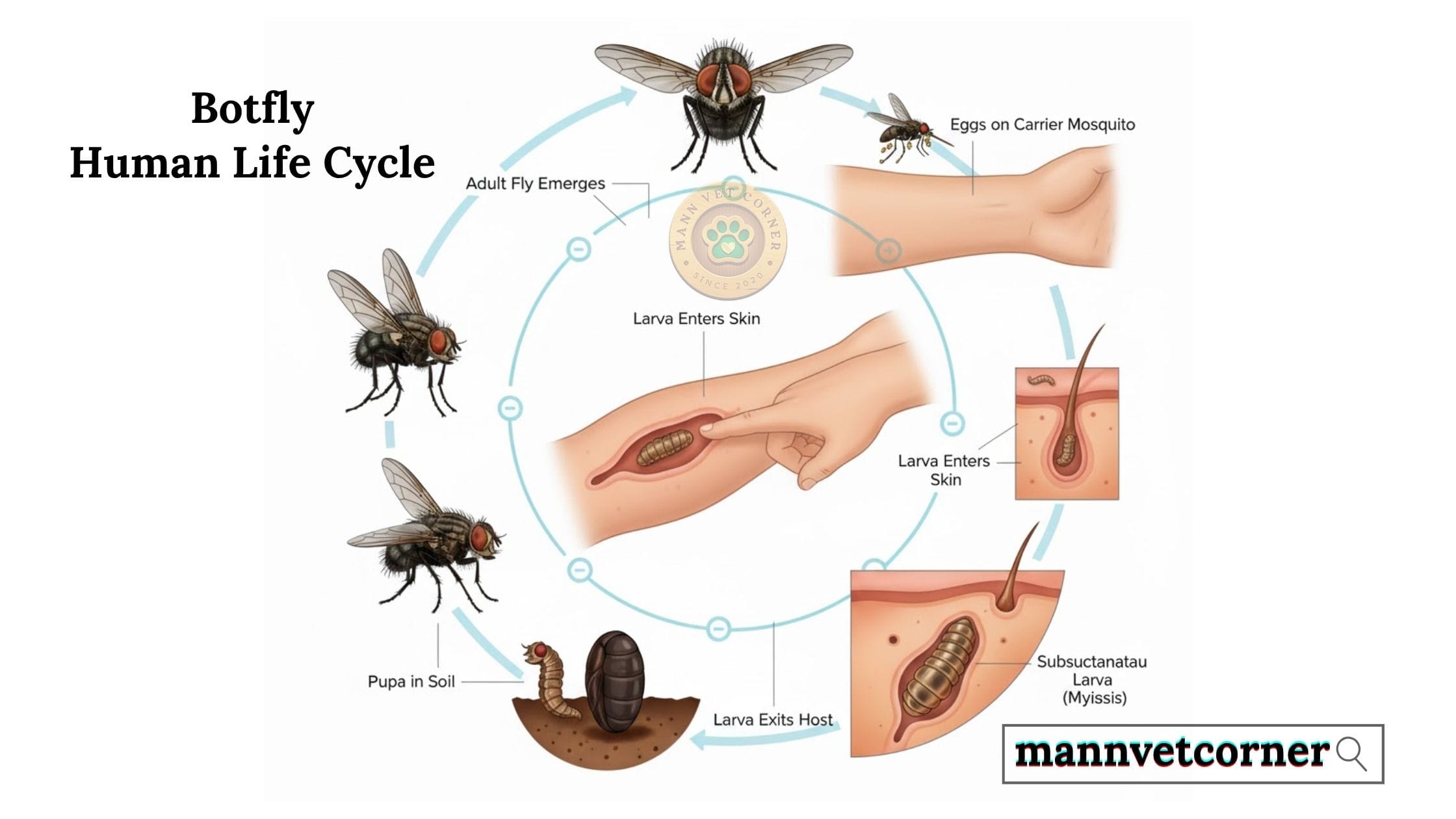 Botflies belong to the Oestridae family, comprising over 150 species of parasitic flies. These insects complete their larval development inside living mammals, including humans, dogs, cats, horses, cattle, and wildlife. Unlike mosquitoes that simply bite and leave, botflies deposit their larvae beneath the skin, where they develop over several weeks.