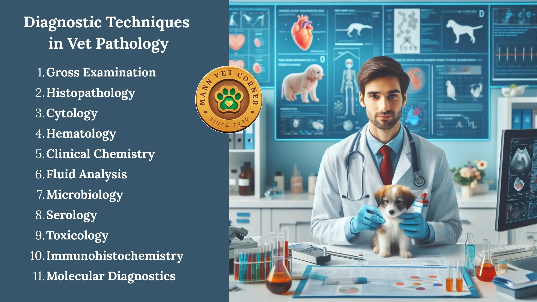 Veterinary pathology employs a diverse array of diagnostic techniques, ranging from gross examination to advanced molecular diagnostics, to accurately identify and manage diseases in animals. These methods, including necropsy, histopathology, cytology, hematology, clinical chemistry, fluid analysis, microbiology, serology, toxicology, immunohistochemistry, and molecular diagnostics, collectively enable veterinarians to diagnose conditions, monitor health, and implement effective treatments across species like dogs, cats, cattle, horses, poultry, and wildlife.