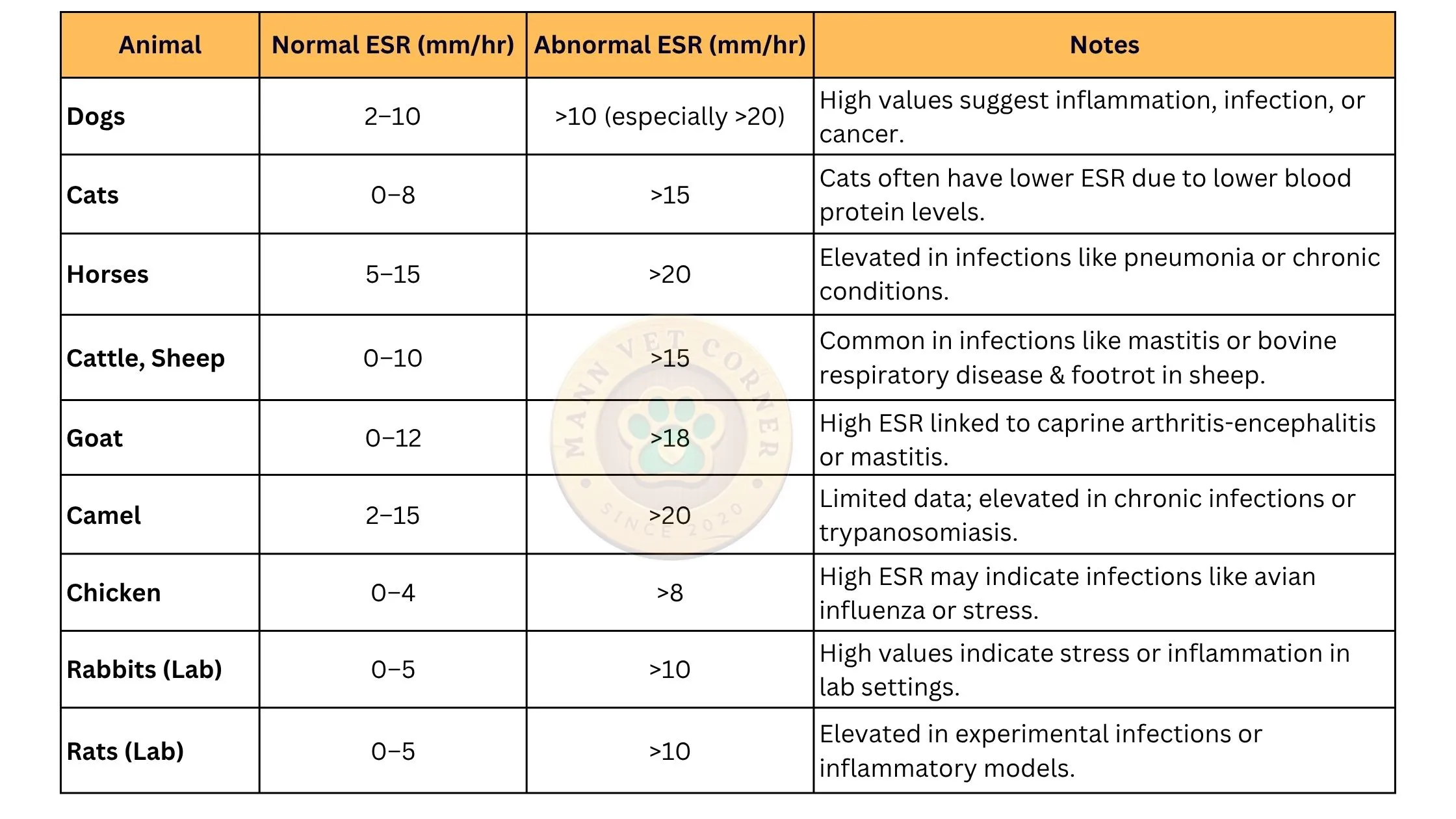 ESR values vary by species, age, and sometimes gender. Since animals like dogs, cats, horses, and lab animals (e.g., rabbits, rats) have different blood compositions, their normal ranges differ. Below is a table summarizing normal and abnormal ESR values for common domestic, lab, and pet animals: