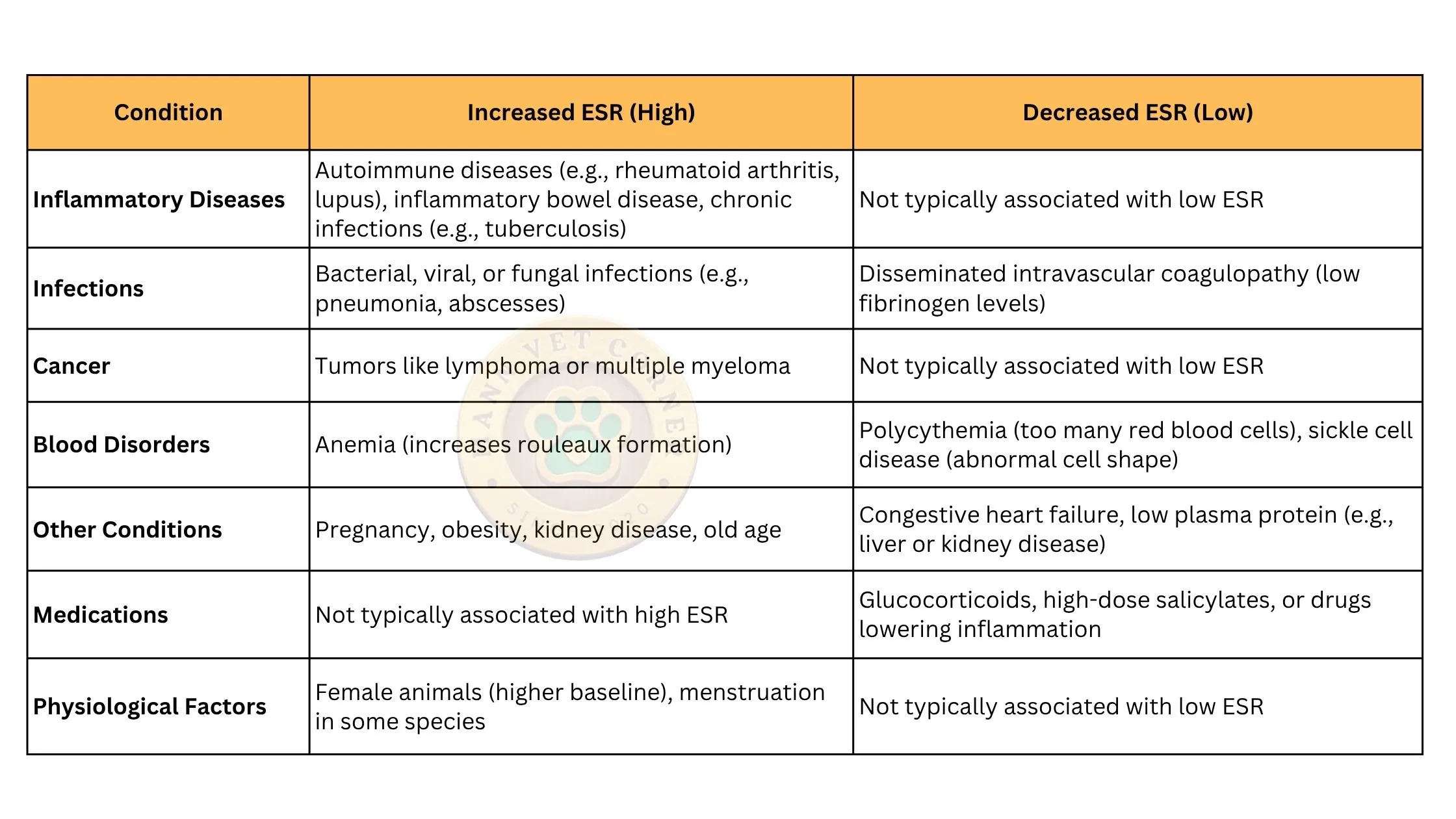 ESR can go up or down depending on the animal’s health. The table below lists the main reasons for changes in ESR, making it easy to understand what might be happening in a patient.