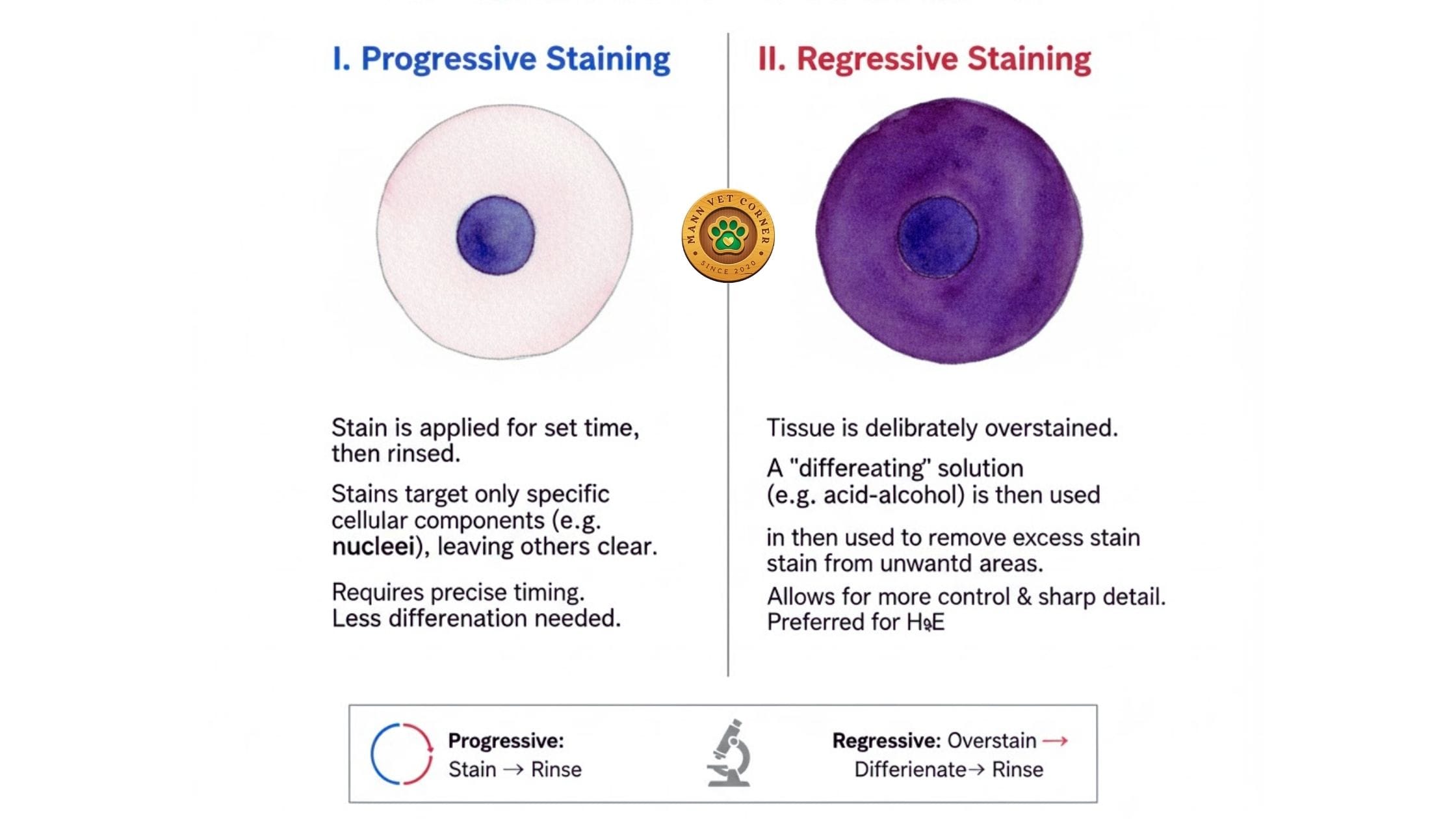 Regressive staining overstains tissues initially, then removes excess dye through differentiation. This approach offers more control over final staining intensity.