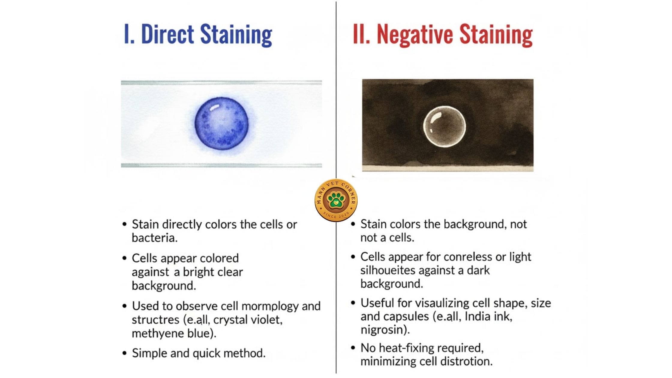 Direct staining colors organisms or cellular elements while leaving backgrounds unstained. Most routine veterinary stains work through direct mechanisms.