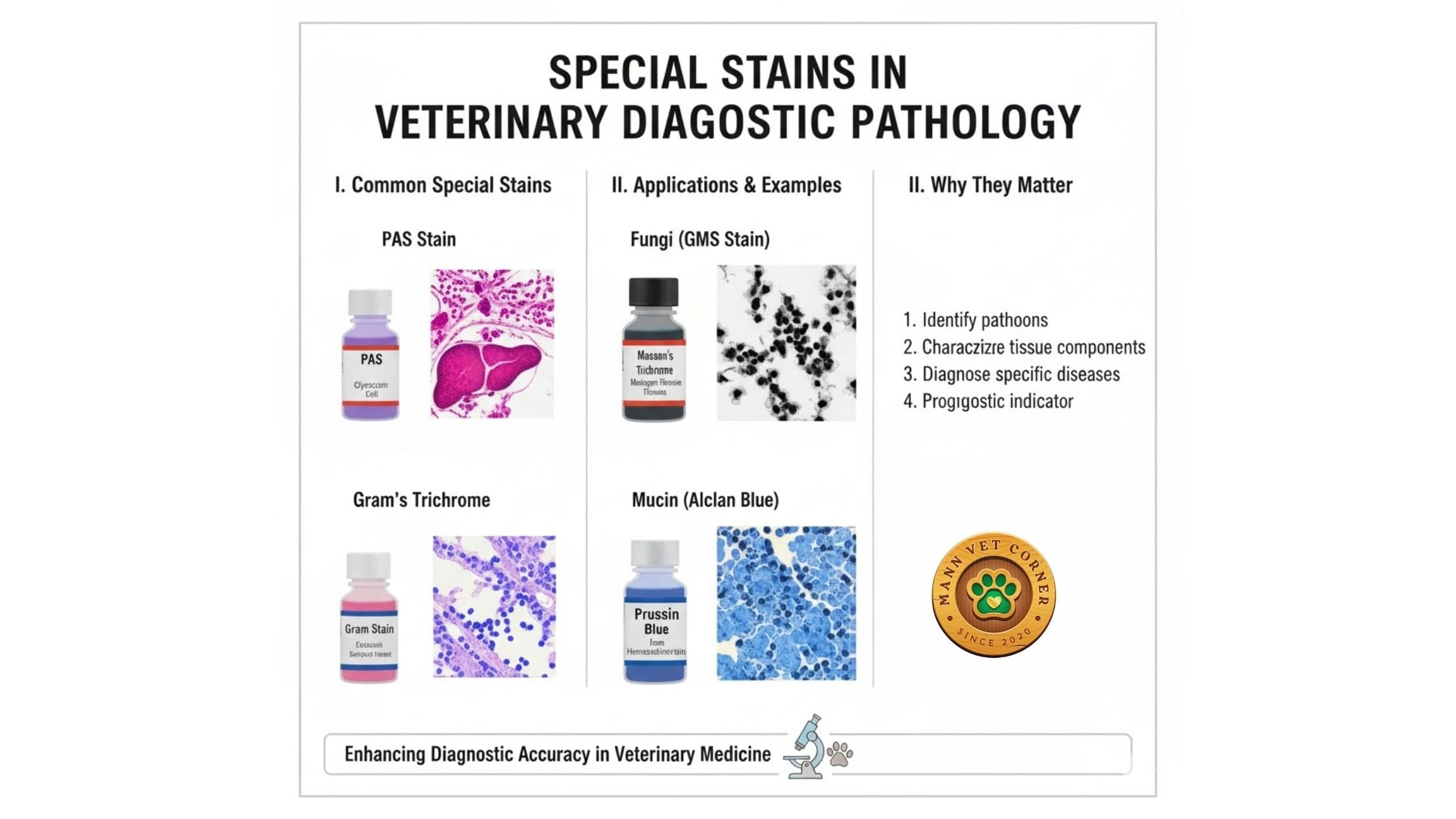 Beyond routine H&E staining, veterinary laboratories employ specialized techniques for specific diagnostic purposes.