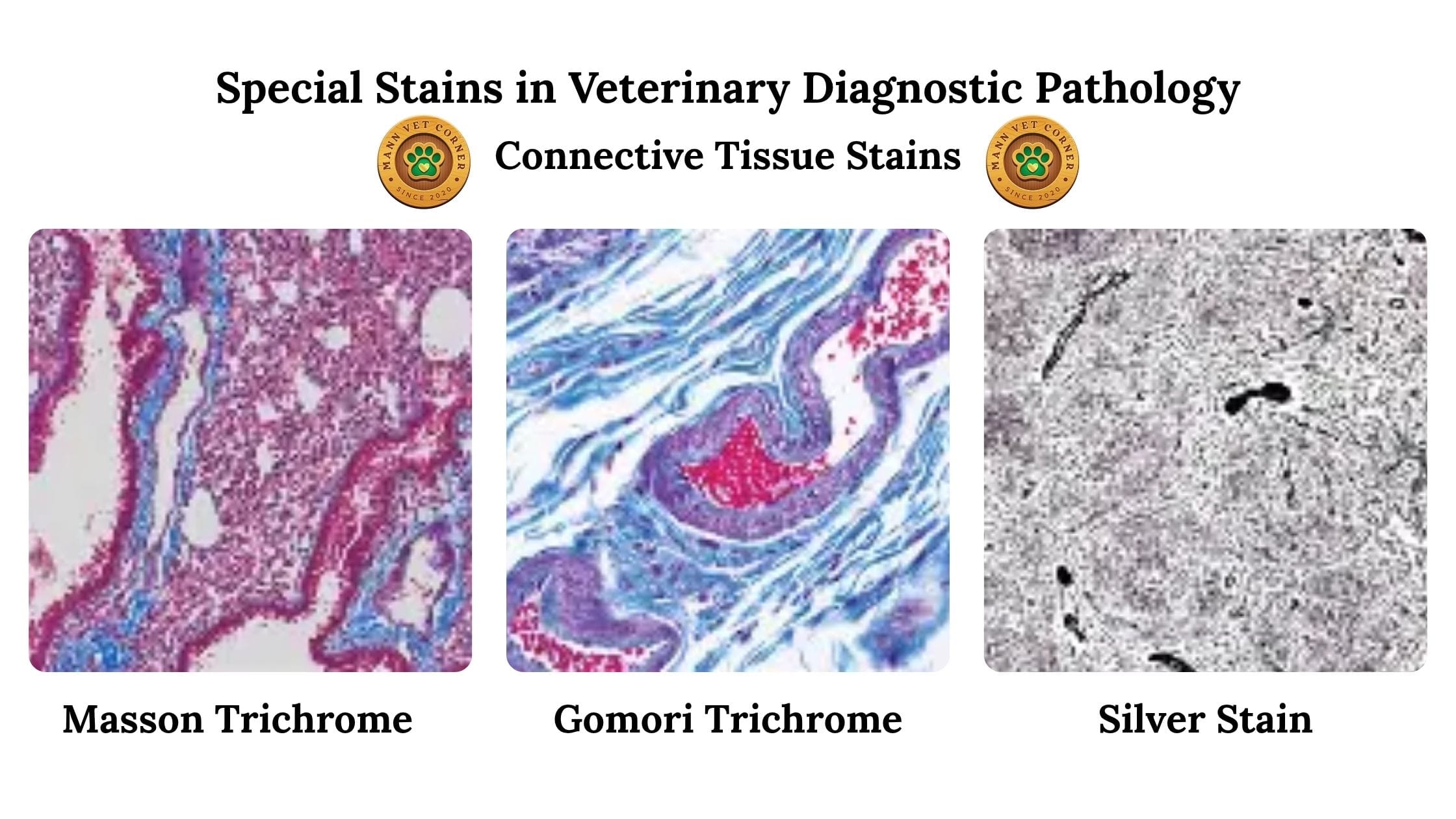 Gomori Trichrome comes in blue and green variants, both identifying muscle fibers and collagen. Veterinarians use these stains when examining cardiac muscle degeneration or skeletal muscle disease.