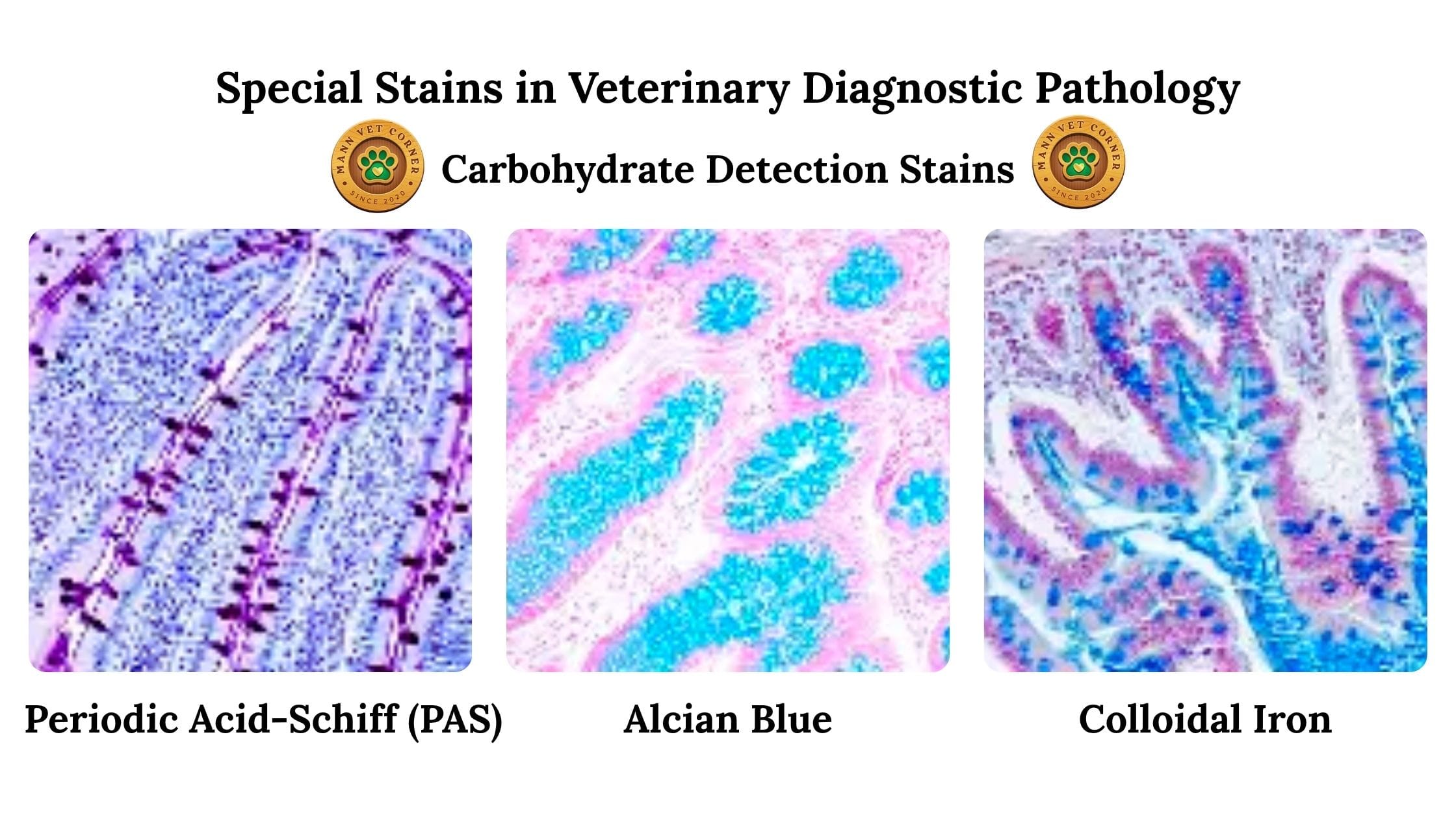 Periodic Acid-Schiff (PAS) highlights glycogen, glycoproteins, mucins, and glycolipids. Intestinal epithelium stains pinkish-red while goblet cells turn deep magenta. Veterinary pathologists use PAS for diagnosing storage diseases and identifying fungal organisms.