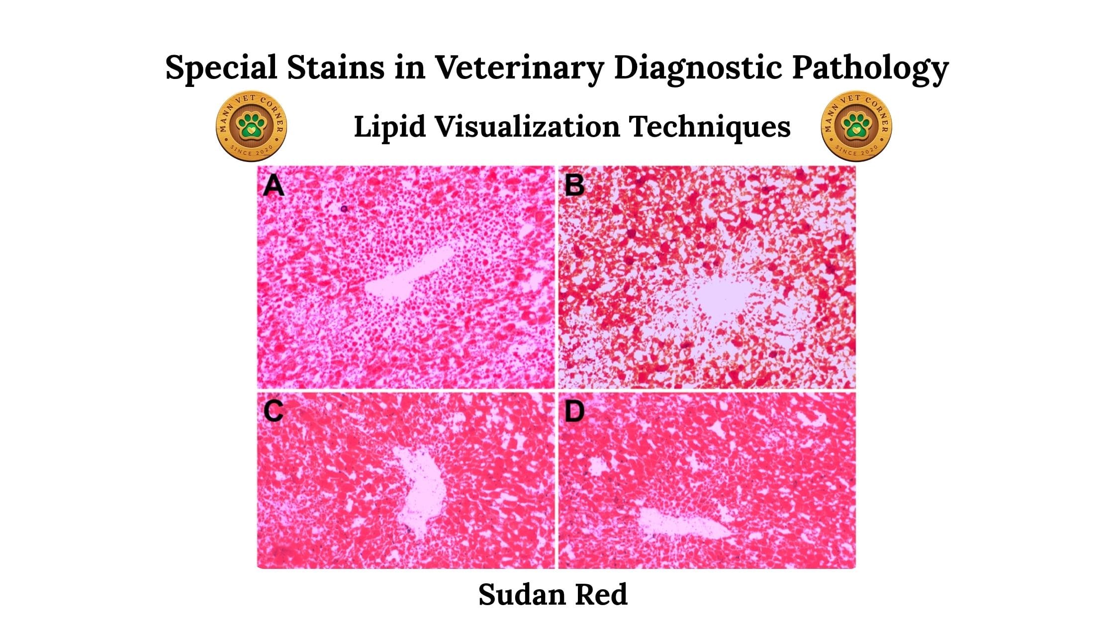 Sudan Red colors lipids, phospholipids, and triglycerides intense red to orange. Frozen sections require special handling since paraffin processing dissolves lipids. Veterinarians apply Sudan stains when diagnosing fatty liver disease or lipid storage disorders.