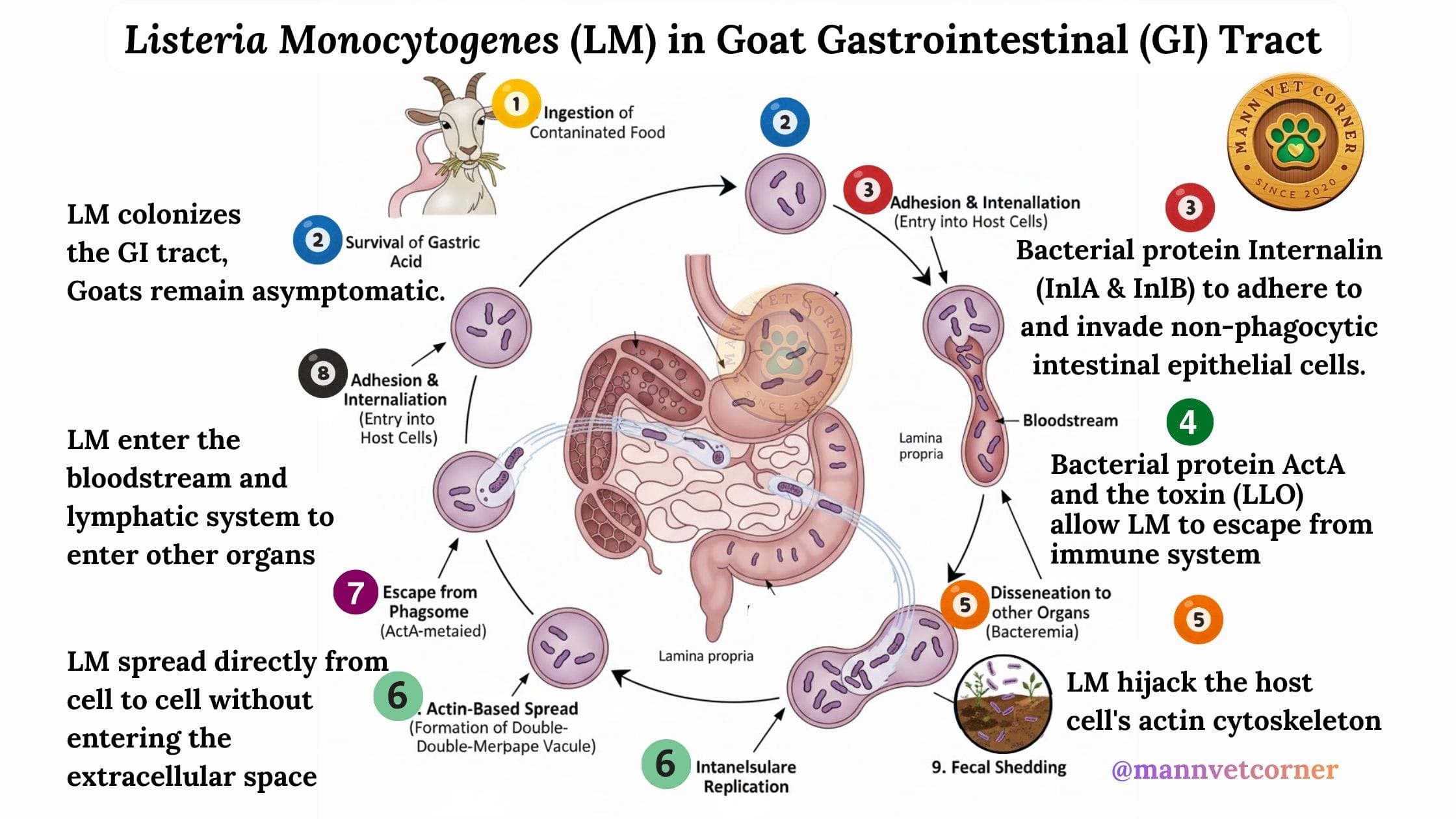 - Gastrointestinal colonization: After ingestion, L. monocytogenes colonizes the gut and can invade the bloodstream, but in ruminants, it frequently takes a neural route to the brain.