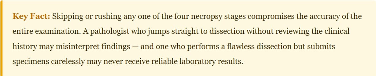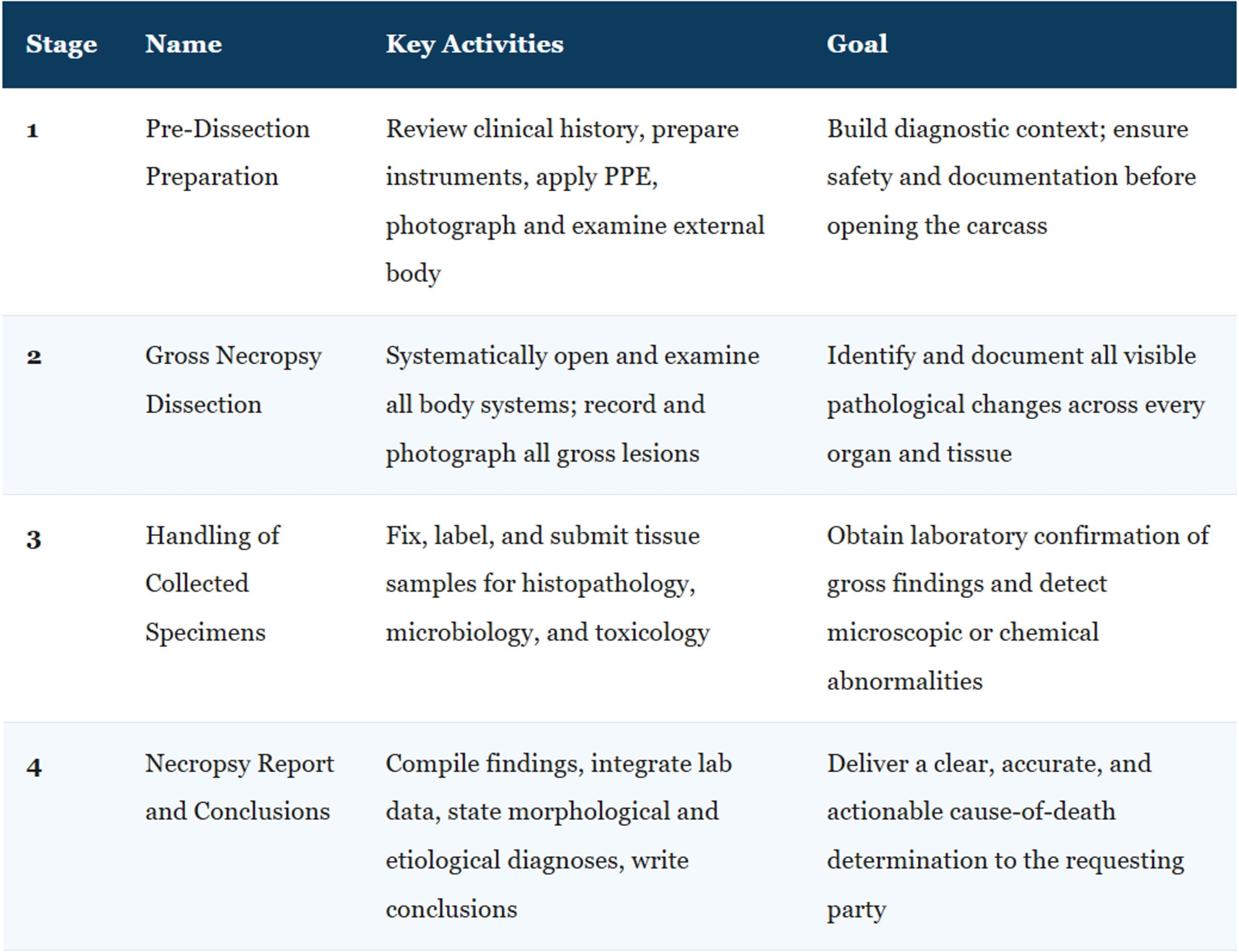 A necropsy that rushes stage one produces a pathologist who misreads lesions without context. It also handles specimens carelessly in stage three produces laboratory reports that contradict or fail to explain the gross findings. In stage four of necropsy as an afterthought produces a report so vague it answers nothing. Each stage deserves the same level of care, precision, and professional rigor.