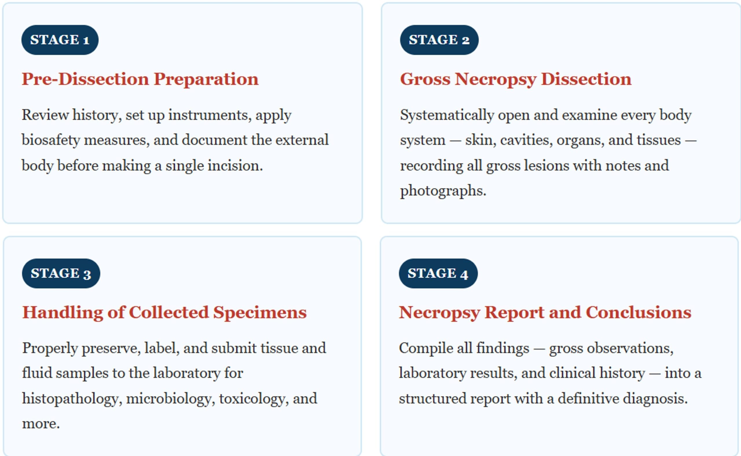Most people consider necropsy as just the gross dissection of a carcass — the cutting, opening, and visual inspection of the body. That assumption is understandable, because dissection is the most dramatic and visible part of the process. However, a complete necropsy covers far more than the moment of dissection. Veterinary pathologists divide the full procedure into four distinct stages, each with its own purpose, techniques, and standards of practice.