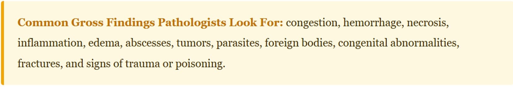The word “gross” does not refer to anything unpleasant. In pathology, “gross examination” means macroscopic examination — the evaluation of structures visible to the naked eye, without magnification. The pathologist looks at size, shape, color, texture, consistency, and odor of each organ and tissue. Only later, at the laboratory, does microscopic examination take over.