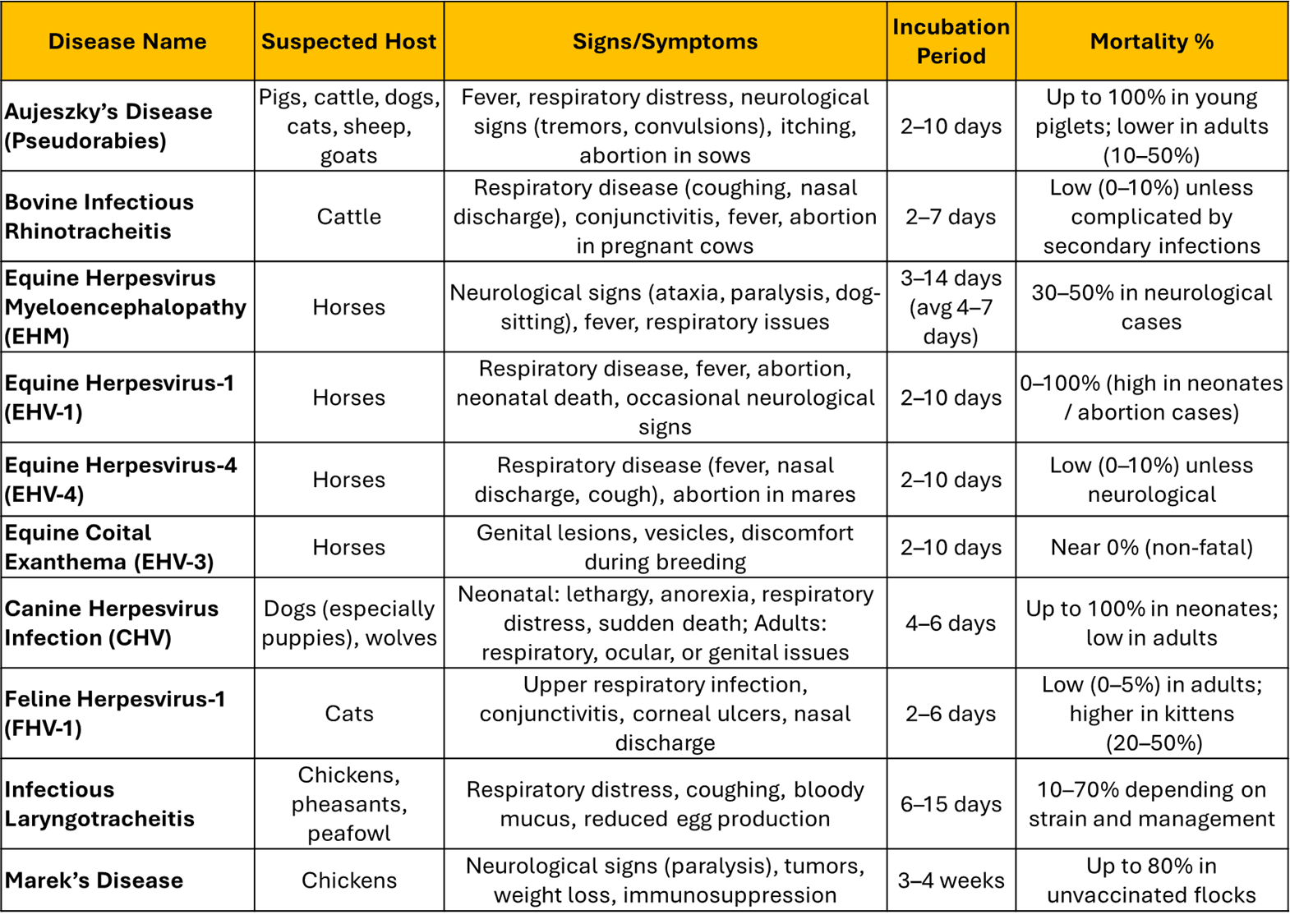 Animals face similar herpesvirus challenges. Feline herpesvirus-1 causes respiratory and eye issues in cats, especially kittens. Equine herpesvirus-1 and -4 in horses lead to respiratory disease, abortions, or neurological issues like ataxia. In chickens, Marek’s disease (caused by Gallid herpesvirus) results in tumors and paralysis, devastating poultry farms. Canine herpesvirus affects puppies, causing severe respiratory distress and high mortality. Other animals, like cattle (bovine herpesvirus) and monkeys (Herpes B), face species-specific herpesviruses. These diseases impact animal welfare and industries, prompting natural remedy exploration due to cost, safety, and drug resistance concerns.