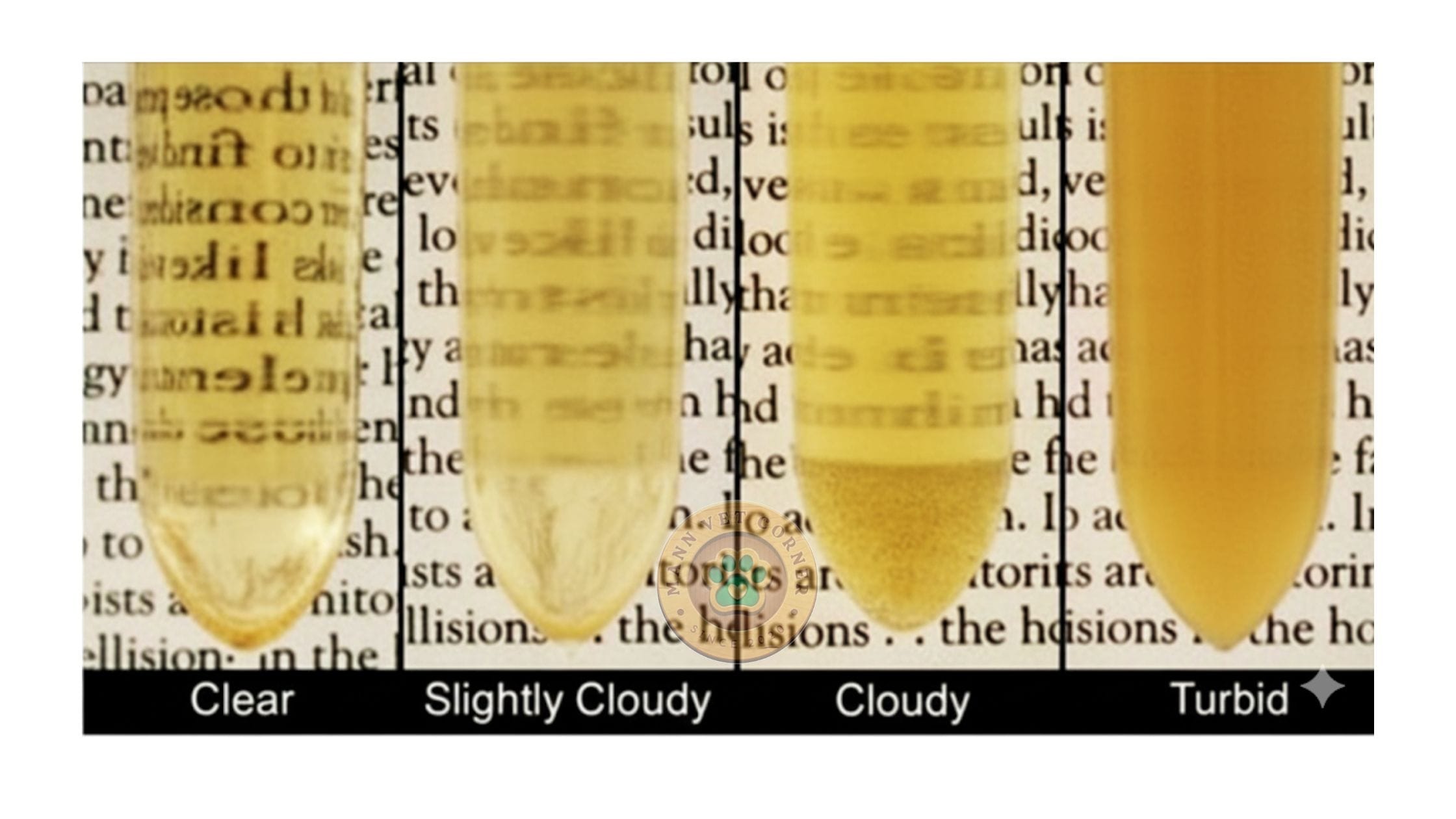- Pathological turbidity: pus, cells, bacteria, crystals, or fat droplets.